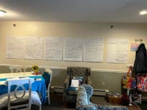 As you may have heard, I have begun work on my new novel which is tentatively called Feathers in the Sand. For the last few months I’ve been devoting my scheduled writing time to creating characters, doing research, imagining settings, and dreaming up plot points. This photo shows part of my process of creating/getting to know the main characters (me and my imagination, holed up in a hotel room in Maine, with colored markers and lots of paper!).