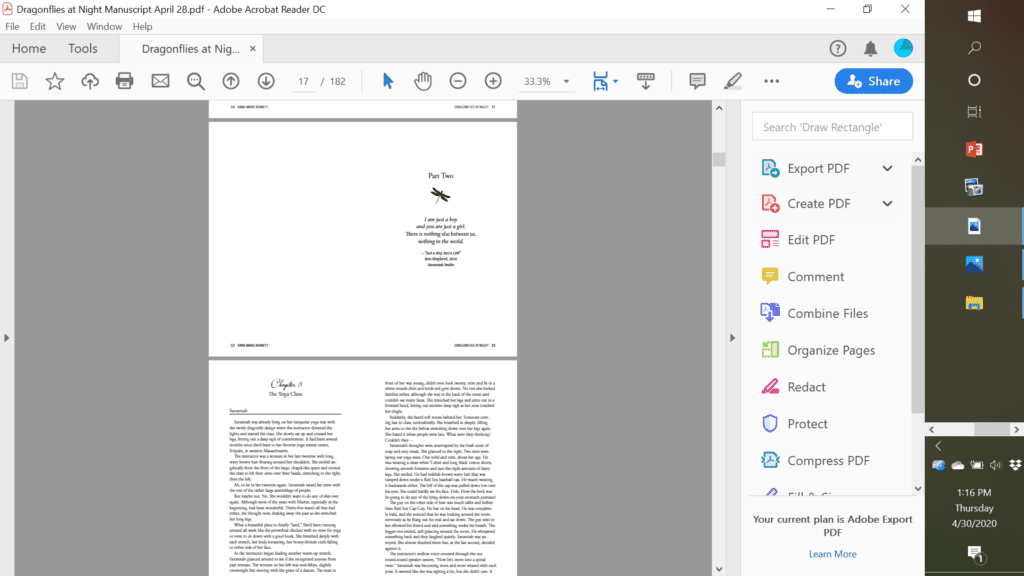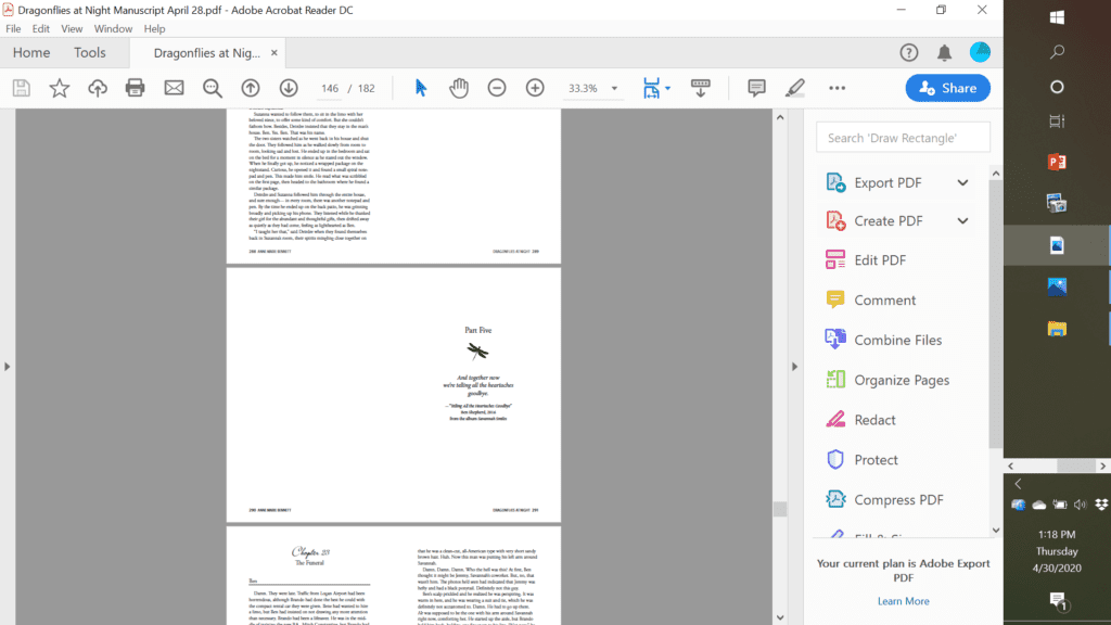 This week (among other things!) I’ve been working with Carol Coogan, my illustrious and very talented book designer, on the interior layout for the 9/22/20 release of my women’s novel, Dragonflies at Night.