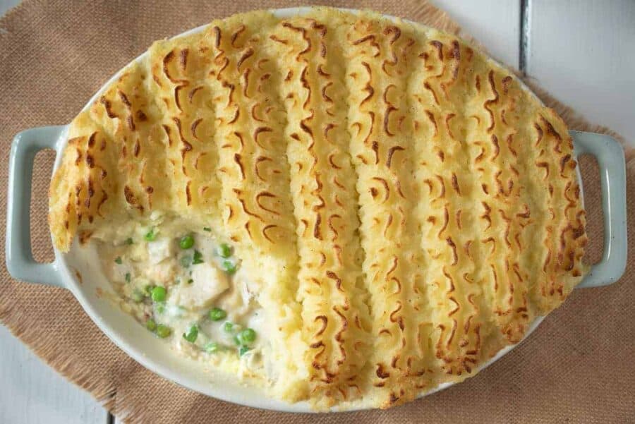 - Preheat oven to 400°. Rub a 9×12 casserole dish with butter or spray with oil.For the filling:1. To a large pan add the fish, milk, onions, bay leaf and salt. Simmer for 5 minutes. Turn off the heat and allow fish to cool in the liquid. Once cooled, strain the milk through a sieve separating the fish and milk. Remove the bay leaf and set the fish and milk aside.2. To a pan add the butter over medium heat. When melted and bubbling whisk in the flour. Slowly pour in the milk broth from the fish while whisking, simmer until thickened. Add the fish and onions, shrimp, scallops, and peas. Taste for seasoning and add salt if needed.3. Pour the fish and vegetables into a baking dish. Top with the mashed potato and brush the top with melted butter. Place on a large baking sheet (in case it bubbles over).4. Bake for 20-25 minutes until the top is golden brown. If the top doesn’t brown as much as you want it to, heat under the broiler but keep an eye on it until browned.